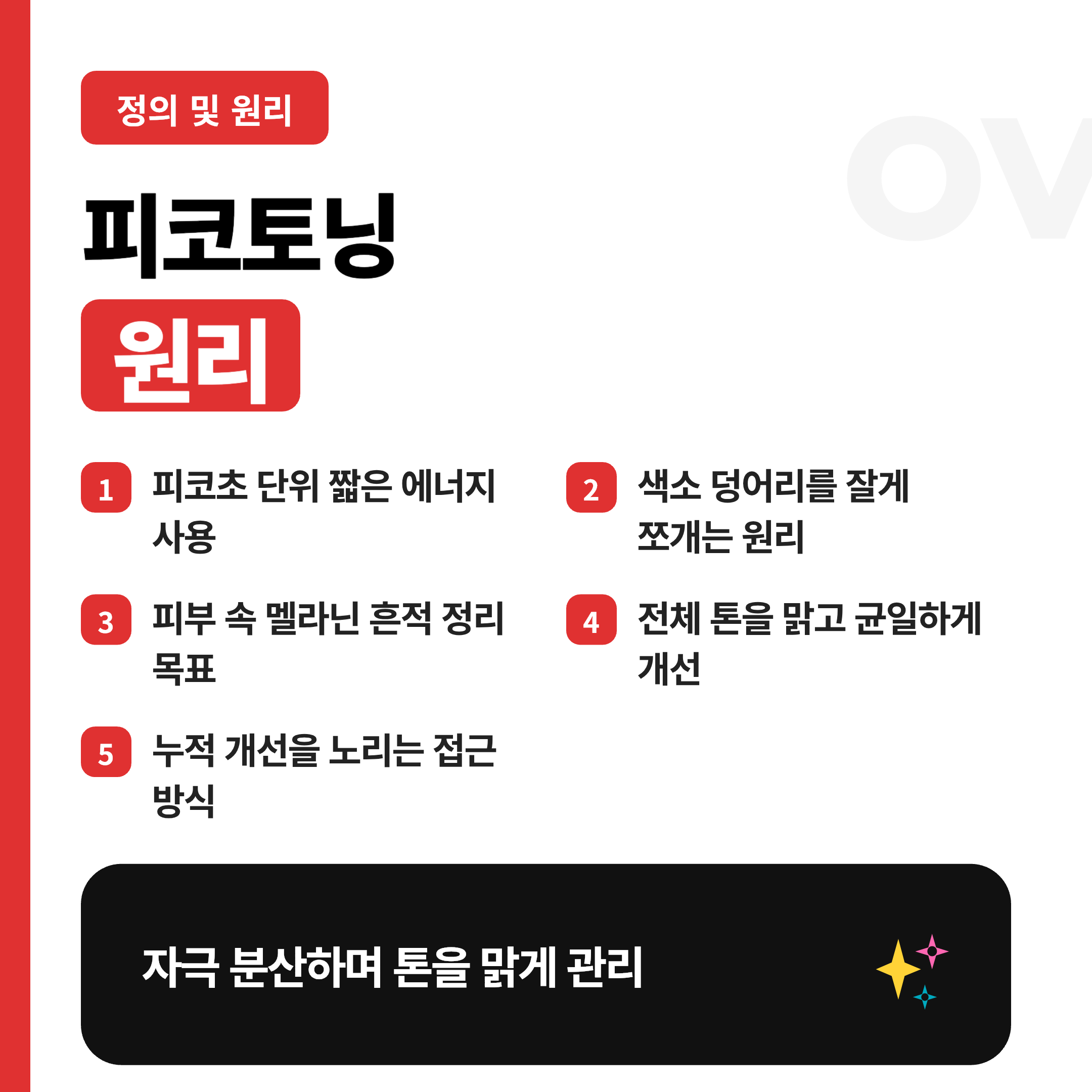 피코토닝은 피코초 단위로 매우 짧게 에너지를 전달하는 레이저를 활용해요. 짧은 시간에 에너지가 들어가면 열이 오래 머무는 느낌이 줄어들고, 목표로 하는 색소 덩어리를 더 잘게 쪼개는 방향으로 작동해요.