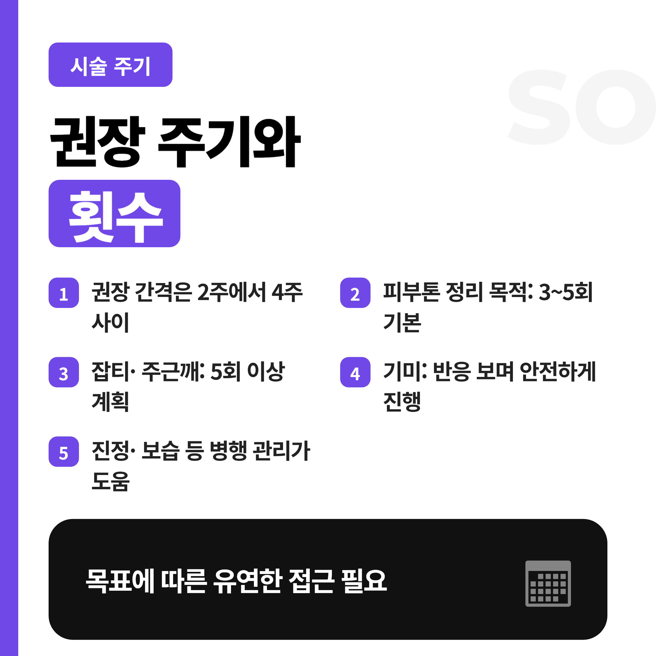 • 권장 간격은 대체로 2주에서 4주 사이로, 피부 반응과 목표에 따라 달라져요