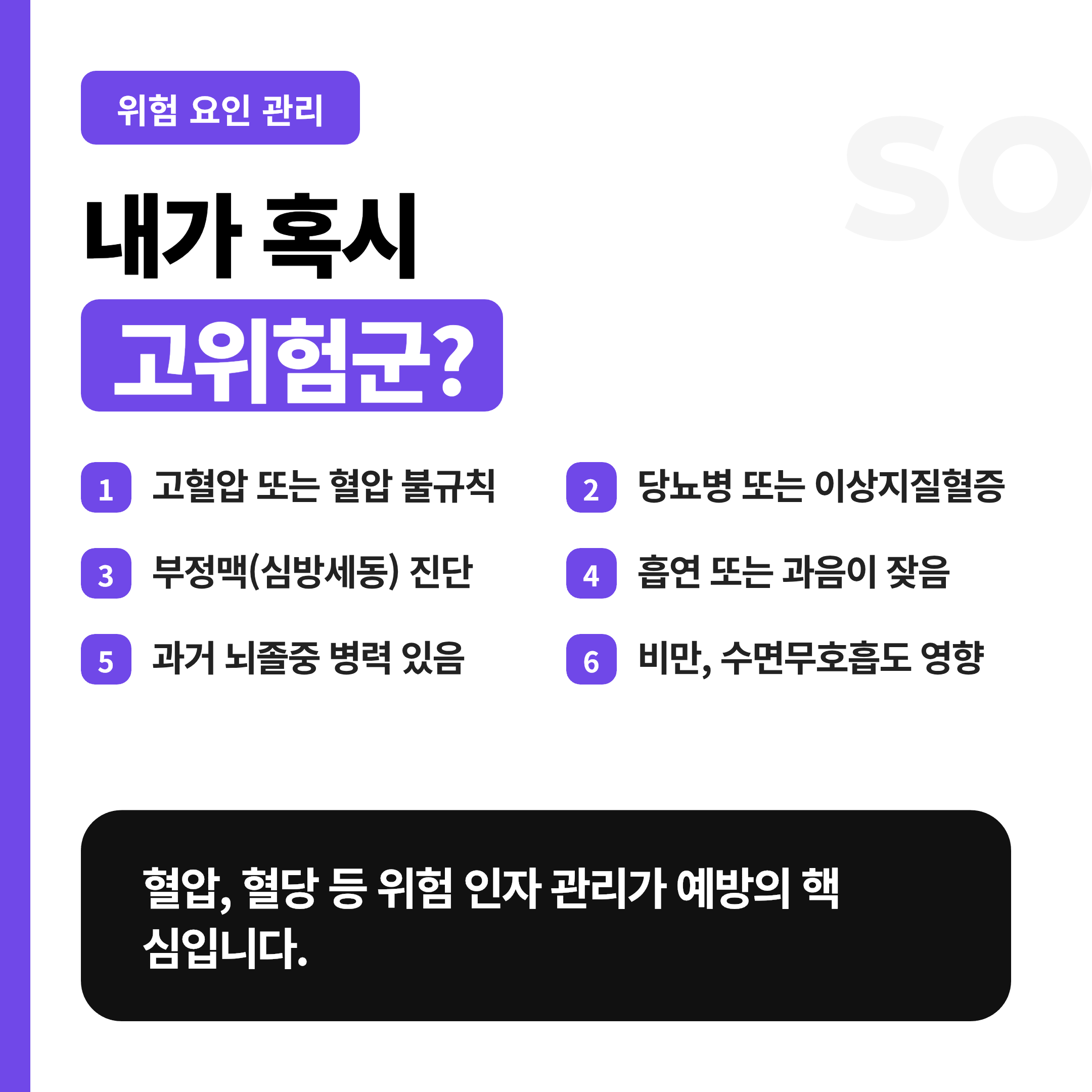 뇌졸중은 누구에게나 생길 수 있지만, 특정 조건이 있으면 위험이 더 높아져요. 아래 항목이 많을수록 전조증상을 더 민감하게 받아들여야 해요.