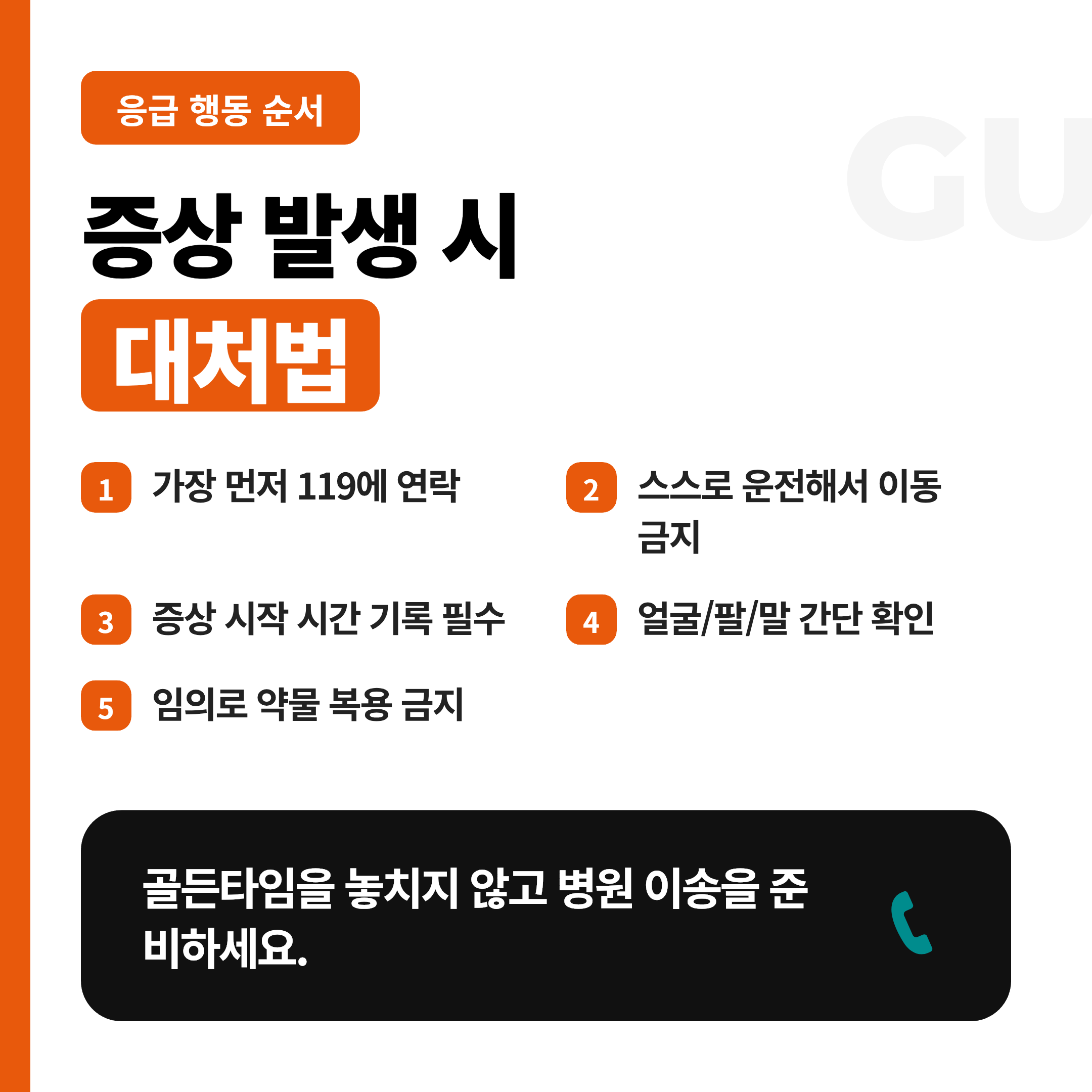 뇌졸중은 집에서 지켜보다가 좋아지길 기다리면 위험해질 수 있어요. 아래 순서대로 행동하면 도움이 돼요.