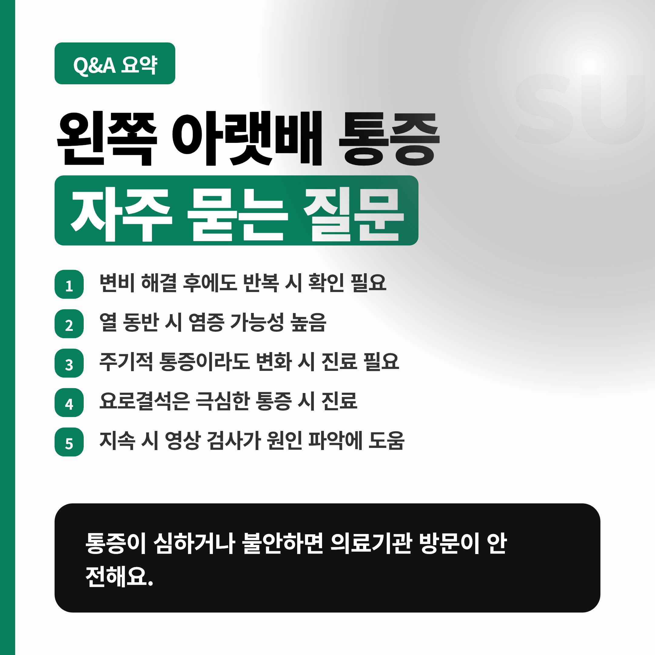 왼쪽 아랫배 통증이 있어도 모든 경우가 위험한 건 아니에요. 하지만 아래 항목 중 하나라도 해당되면 빠르게 진료를 권해요.