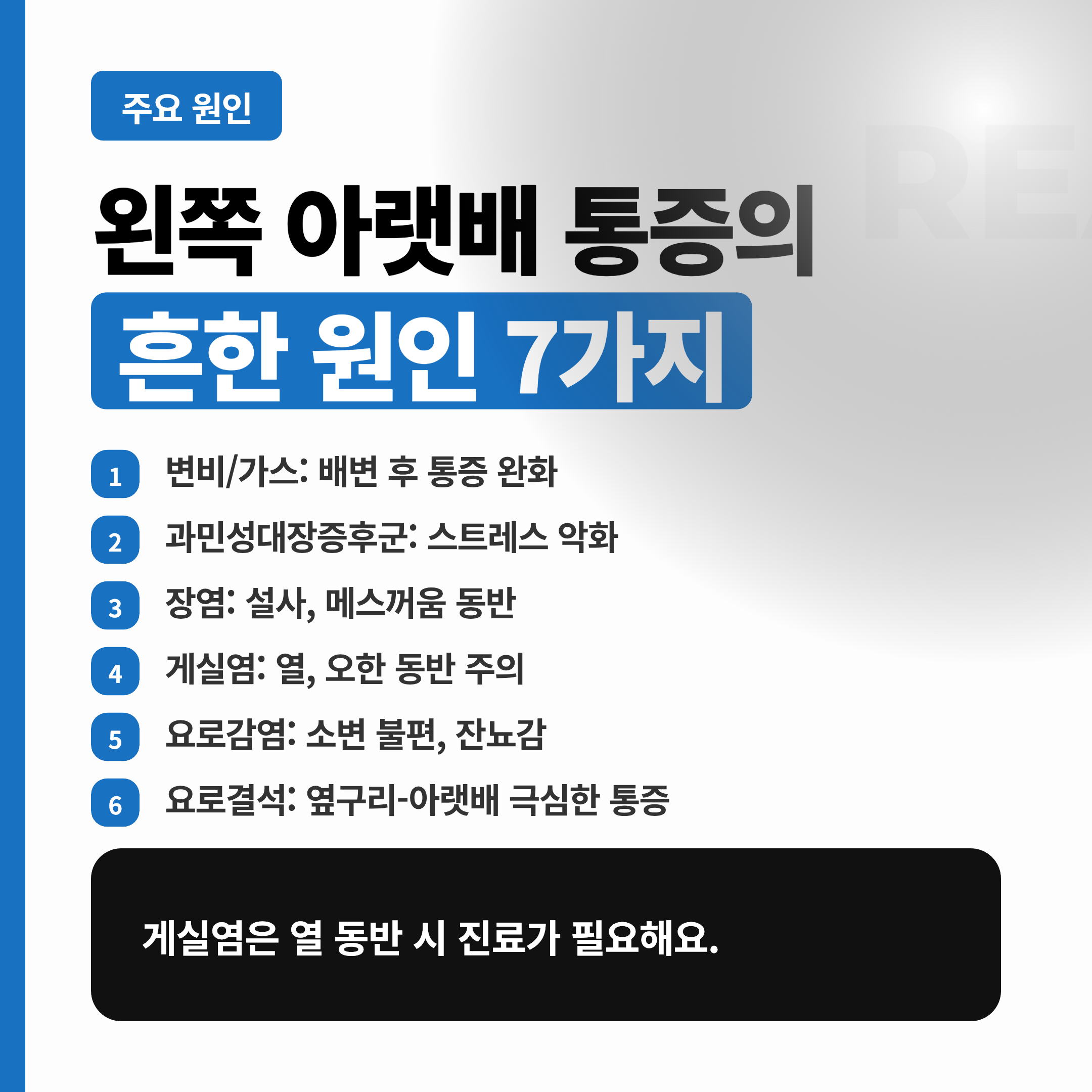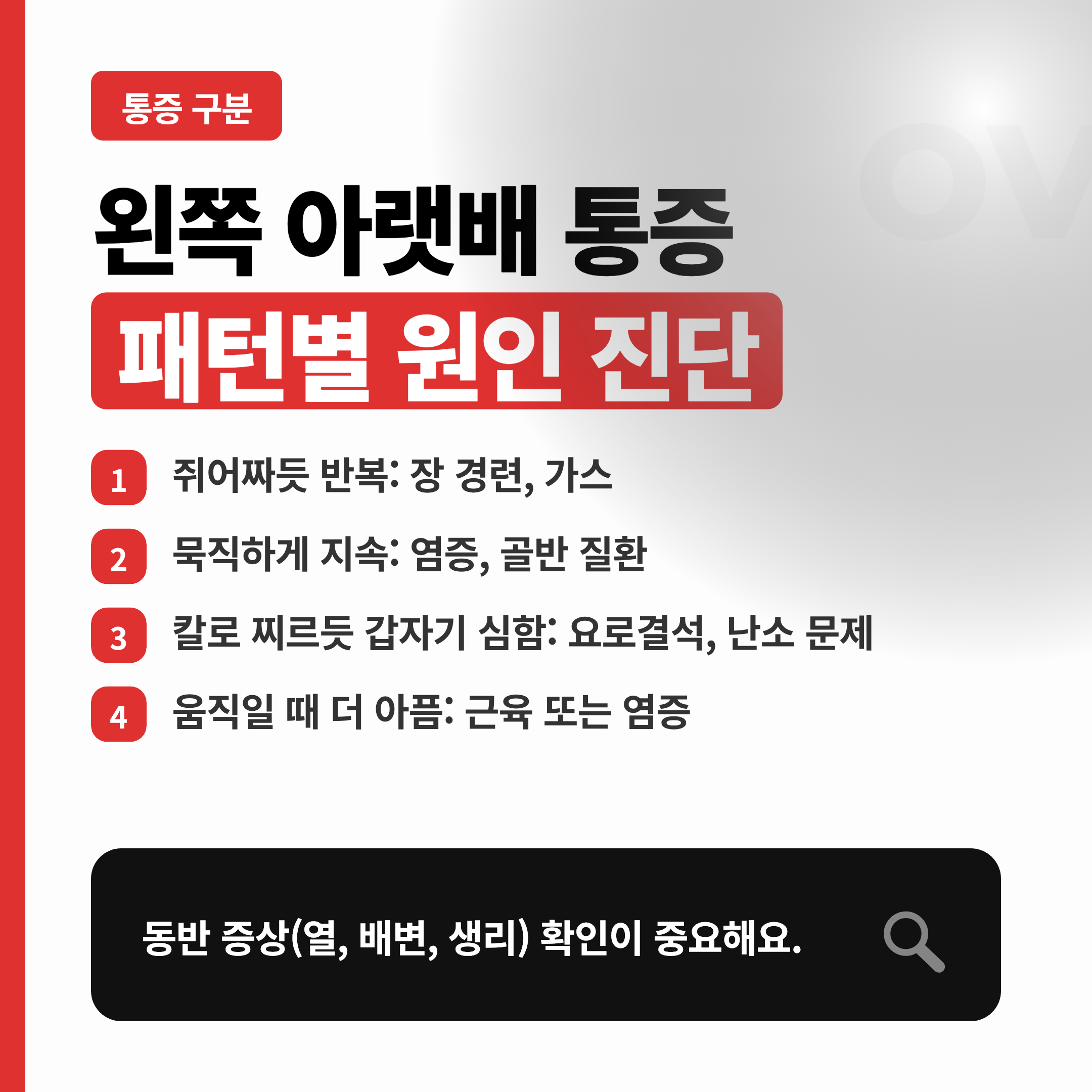 왼쪽 아랫배는 대장과 요관, 방광, 여성 골반 장기가 가까워요. 아래는 실제로 많이 연결되는 원인들이에요.